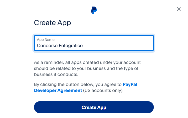 Inserire un nome alla App e cliccate in basso su "Create App" Nell'esempio è indicato genericamente Concorso Fotografico, potete indicare quello che volete, questo nome serve per riconoscere il canale di pagamento.